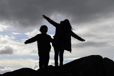 Keywords: backlight silhouettes horizon people tourists happy sky sunset clouds landscape photo setting sun smile