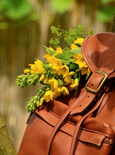 Keywords: backpack brown leather closure buckle leather seam readers were bouquet still life rustic mother's day greeting card yellow flowers goldfelberich birthday romantic thank you greeting bloom postcard