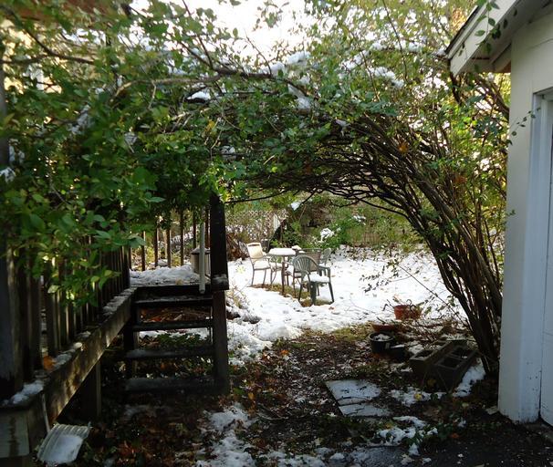 Keywords: Backyard arbor bush bending over like a roof.jpg en This bush normally stands upright but an early snowfall bent it sideways enclosing the space between the house and the garage 2012-11-09 16 41 01 own Tomwsulcer cc-zero Uploaded with UploadWizard Shrubs |