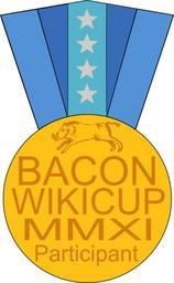 | Keywords: Bacon WikiCup 2011 Medal.svg A medal awarded to all participants in the Bacon WikiCup 2011 an event that occurred during the Bacon Challenge 2011 own / Derived from Crudeboar svg Public Domain 2011-03-29 Kevin Payravi Wikimedia Commons Inkscape 2011 medals SVG medals |