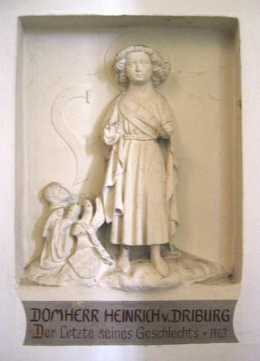 | Keywords: Bad Driburg St. Peter und Paul Heinrich von Driburg.jpg In die Mauer eingelassener Epitaphrest in der katholischen Pfarrkirche St Peter und Paul in der Innenstadt von Bad Driburg Deutschland Inschrift DOMHERR HEINRICH v DRIBURG Der Letzte seines Geschlechts 1463 Die beschÃĪdigte Grabplatte wurde 1796 aus dem Kreuzgang des Paderborner Doms ausgebrochen der erhaltene Teilstein nach Driburg gebracht und dort in der Pfarrkirche vermauert Der Domherr mit dem Familienwappen ist unten links dargestellt; die rechte Figur wird als Jesus Christus gedeutet own 2004 bdk bdk St Peter und Paul Bad Driburg 2004 in Bad Driburg Wall mounted church monuments in North Rhine-Westphalia Gothic church monuments in North Rhine-Westphalia 1463 church monuments in Germany |
