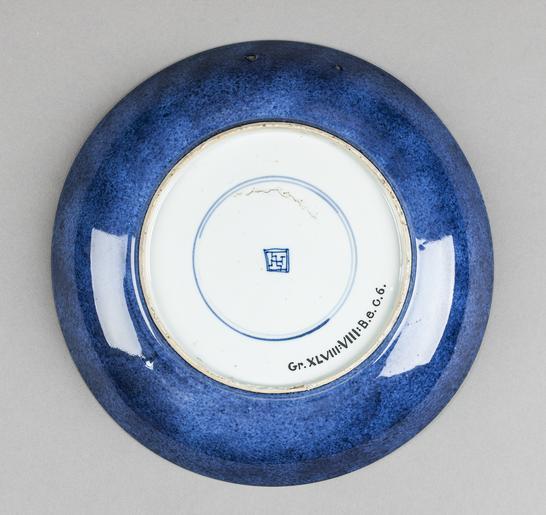 Keywords: Baksidan av fat - Hallwylska museet - 100928.tif LSH artwork sv FAT Runt skålformigt på låg fotkant Dekor i famille verte gröna familjen i fem utsparda konturerade fält mot mörkblå botten på denna växtornament i konturteckning i guld I mittenfältet en klippa krysantemumblommor en fågel I två av de omgivande fälten blommor i ett landskap med båt i det handra några av de hundra dyrbarheterna po ku Mellan fälten i guld tre enkla blommor; kring brädden en guldrand Bräddkanten i brunt Utsidan blå botten vit Glasyren på ett par ställen med obetydliga ojämnheter på bottens utsida ett långsträckt sår tillverkningsfel <br/>Inköpt av Wilhelmina von Hallwyl från konsthandlaren J Bosshard Luzern Schweiz 1911 ur August Edward Jessup 1861-1925 samling<br/>Porcelain dish with cobalt blue glaze overglaze enamel decoration and gilding<br/>Qing dynasty Kangxi period 1662-1722 <br/>Complex decoration in this style was popular because of its opulence First the dish had cobalt blue glaze blown onto the surface through a bamboo tube to give an effect called powder blue Shaped cartouches were left reserved in the blue glaze and the rim was dressed to strengthen it Then the dish was fired in a high-temperature kiln Delicate enamelled designs were painted within the cartouches and the dish was fired again at a lower temperature Then the blue-glazed portions were gilded and the piece was fired a third time original caption Baksidan av fat <br/> Nyckelord Porslin Kinesiskt porslin Föremålsbild - 1662 1722 size mm 26 5 HWY place of origin CN original filename hm_dig16354 15421 inventory number HWY XLVIII VIII B e c 06 100928 CC-BY-SA Jens Mohr <gallery caption Different images of same object > File Porslinsfat med famille verte gröna familjen - Hallwylska museet - 100927 tif </gallery> Porcelain of China Porcelain Chinese ceramics in the Hallwyl Museum Sweden Glass Vessel container Ceramics of Korea Ceramics of Japan Ceramics Jens Mohr Media contributed by LSH 2015-11 |
