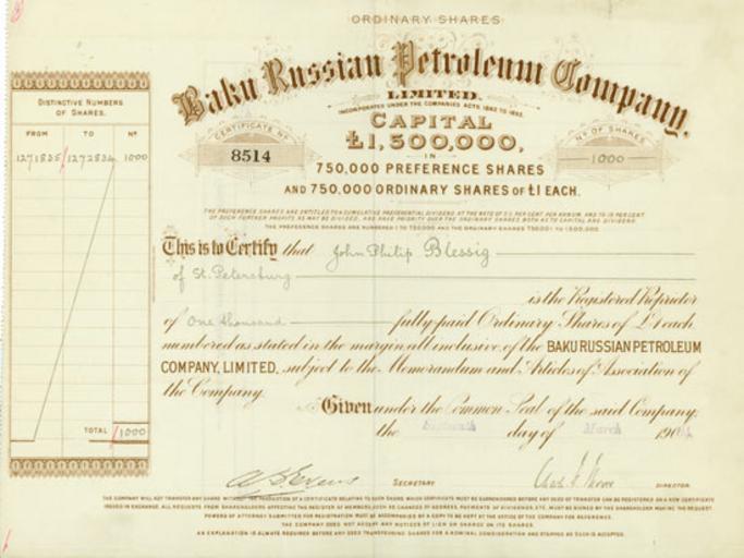 | Keywords: Baku Russian Petroleum Company Limited, 1904.jpg en Titel Baku Russian Petroleum Company Limited Titel Russisch Russian Petroleum Company Limited Land Russland Aserbaidschan Beschreibung 16 03 1904 1 000 Ordinairy Shares á £ 1 8514 23 1 x 30 9 cm braun beige Knickfalten Jelowskich/Ivankin 292 A 2 Beschreibung Russisch 16 03 1904 1 000 акций в 1 шиллинг каждая 8514 23 1 x 30 9 см ко ичневый бежевый складки в каталоге Еловских/Иванкина 292 A 2 на английском языке 1904 Taken from http //www hwph de/historische-wertpapiere/losnr-auktnr-pa15-222 html this site Baku Russian Petroleum Company Limited Custom license marker 2014 03 26 PD-old-100 Uploaded with UploadWizard 1904 in Baku |