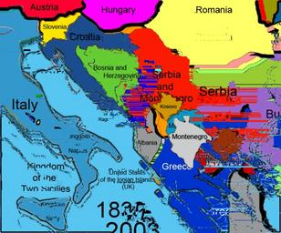 | Keywords: Balkans Animation 1800-2008.gif right border 0 style border 1px solid 000000; +LEGEND - colspan 4 Modern Day countries - 999999 width 30 10 Albania Albania - ff0033 width 30 10 Austria Austria - 66cc33 width 30 10 Bosnia and Herzegovina Bosnia and Herzegovina - 9966cc width 30 10 Bulgaria Bulgaria - 336699 width 30 10 Croatia Croatia - 0033cc width 30 10 1831-1973 Kingdom of Greece<br> Greece Greece - ff00ff width 30 10 Hungary Hungary - 3399cc width 30 10 Italy Italy - 993300 width 30 10 Kosovo 25px - 0099cc width 30 10 Republic of Macedonia 25px - 999900 width 30 10 Moldova Moldova - cccccc width 30 10 Montenegro Montenegro - ffff66 width 30 10 Romania Romania - ff3300 width 30 10 Serbia Serbia - ffcc00 width 30 10 Slovenia Slovenia - 99ff66 width 30 10 1800-1918 Ottoman Empire<br> 1918-present Turkey Turkey - 006699 width 30 Animated maps of Europe 10 Ukraine Ukraine - colspan 4 Former countries - ff6666 width 30 10 Austria-Hungarian Empire 25px - cc9900 width 30 10 Septinsular Republic 25px - cc9900 width 30 10 United States of the Ionian Islands 25px - ff9900 width 30 10 Kingdom of Yugoslavia 25px - ff9933 width 30 10 Republic of Ragusa 25px - ff9900 width 30 10 Yugoslavia 25px - colspan 4 Present day Italy - cccccc width 30 10 Free Territory of Trieste 25px - cc66ff width 30 10 Grand Duchy of Tuscany 25px - 3399cc width 30 10 Kingdom of Naples 25px - 3399cc width 30 10 Kingdom of Sicily 25px - 3399cc width 30 10 Kingdom of the Two Sicilies 25px - ffff66 width 30 10 Papal States 25px - 009900 width 30 10 Republic of Venice 25px - colspan 4 Former Yugoslavia - 339933 width 30 10 Bosnia and Herzegovina 20px - 6666ff width 30 10 Croatian Republic of Herzeg-Bosnia 20px - 0000ff width 30 10 Federation of Bosnia and Herzegovina 25px - cc3333 width 30 10 Republika Srpska Republika Srpska - ff6633 width 30 10 Republic of Serbian Krajina Serbian Krajina 1991 - cc00cc width 30 10 Republic of Serbian Krajina Serbian Krajina 1991 - cccc00 width 30 10 Republic of Western Bosnia Animated maps of Europe Notes Borders are not exact but in a lot of cases approximations 1796 thumb Italy 1796 1796 saw two great empires in the Balkans To the north was the Austrian Empire and to the south the Ottoman Empire Italy was fractured peninsula of city states including a few of which are shown on the map The Republic of Venice - The Most Serene Republic of Venice Serenìssima Repùblica Vèneta or Repùblica de Venesia Serenissima Repubblica di Venezia was an Italian state originating from the city of Venice today in Northeastern Italy It existed for over a millennium from the late 7th century until the late 18th century 1797 The Kingdom of Sicily Regnum Siciliae or Sicilie; Regno di Sicilia commonly abbreviated Regno was a state that existed in the south of Italy from its founding by Roger II in 1130 until 1816 The Kingdom of Sicily covered not only the island of en Sicily itself but also the whole Mezzogiorno region of southern Italy and until 1530 the islands of Malta and en Gozo It was sometimes called the regnum Apuliae et Siciliae until 1282 when the mainland separated from the island being known as Kingdom of Naples from then on After 1302 it was sometimes called the Kingdom of Trinacria Often the kingship was vested in another monarch such as the King of Aragon the King of Spain or the Holy Roman Emperor In 1816 the Kingdom of Sicily merged with Kingdom of Naples into the newly created en Kingdom of the Two Sicilies The Papal States State s of the Church or Pontifical States in Italian Stato Ecclesiastico Stato della Chiesa Stati della Chiesa or Stati Pontificii were one of the major en historical states of Italy before the Italian peninsula was unified in 1861 by the en kingdom of Piedmont-Sardinia after which the Papal States in less territorially extensive form continued to exist until 1870 The Papal States comprised those territories over which the Pope was the ruler in a civil as well as a spiritual sense before 1870 This governing power is commonly called the temporal power of the Pope as opposed to his ecclesiastical primacy The Grand Duchy of Tuscany Granducato di Toscana Magnus Ducatus Tusciae was a state in central Italy that existed from 1569 to 1859 replacing the en Duchy of Florence which had been created out of the old en Republic of Florence in 1532 and which annexed the en Republic of Siena in 1557 The Grand Duchy consisted of most of the territory of the current Italian region of Tuscany with the exception of the northernmost portions which formed the en Duchy of Massa the Principality of Carrara and the Republic and then the Duchy of Lucca up to 1847 The Grand Duchy's capital was in Florence Also in existence were the states The Republic of Ragusa or Republic of Dubrovnik was a maritime republic centred on the city of Ragusa Dubrovnik today in southernmost en Croatia in en Dalmatia from the 14th century AD until 1808 <br /> It reached its peak in the 15th and 16th century before being conquered by Napoleon Bonaparte's French Empire in 1808 It had a population of about 30 000 people of which 5 000 lived within the city walls Principality of Montenegro Principality of Wallachia part of modern day Romania under the control of the Ottomans Principality of Moldavia part of modern day Romania under the control of the Ottomans 1800 Napoleon conquered much of Italy and parts of the Republic of Venice The Septinsular Republic Greek Ε τάνησος Πολιτεία Italian Repubblica Settinsulare was an island republic that existed from 1800 to 1807 under nominal Ottoman sovereignty in the Ionian Islands It was the first time Greeks had been granted even limited self-government since the fall of the last remnants of the Byzantine Empire to the Ottomans in the mid-15th century 1807 In secret articles of the 1807 Treaty of Tilsit the Septinsular Republic was ceded by Russia to Napoleon's French Empire and incorporated in the Illyrian provinces 1808 thumb Napoleon conquered much of It