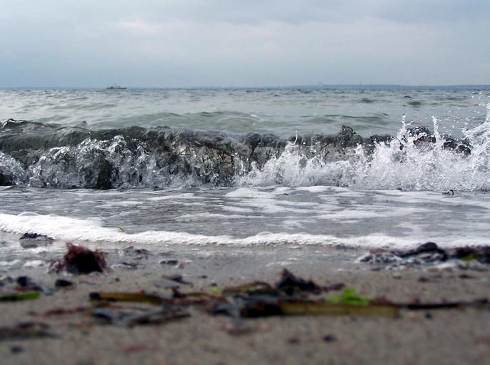 Keywords: baltic sea pelzerhaken germany beach coast surf sea wave spray clouds landscape nature water panorama sand tang seaweed autumn bad weather cold