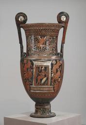 Keywords: Baltimore Painter - Volute Krater - Walters 4886 - Side B.jpg When an ancient artist's name is not known he is often designated by the location of his most prominent work Thus the artist of this vase is known as the Baltimore Painter taking his name from this piece More than 1 500 vases are attributed to this artist who worked in Apulia South Italy The flowery vines elaborately patterned drapery extensive use of foreshortening the technique of drawing objects from the front and creating an illusion of depth and added color are typical of Apulian works This vessel served as a funerary marker On the front the messenger-god Hermes who also guided the dead to the underworld waits as a woman representing the deceased prepares for her journey there The figures on either side may represent other dead souls This type of krater a vessel for mixing water and wine is known as a volute krater because of the spiral scroll-like volute shape of the handles Though generally used for dispensing wine at parties the funerary scenes depicted on the sides of the vessel indicate that it was not created for drinking parties but for use as a burial marker The scenes on the vase represent the underworld The world of the dead was referred to as the house of Hades the domain of that god On the backside is a warrior clothed in Campanian southern Italy clothing seated in a naiskos or shrine ca 320 310 BC Classical terracotta cm 114 60 46 5 accession number 48 86 30814 Joseph Brummer Henry Walters city Baltimore Walters Art Museum Henry Walters Acquired by Henry Walters 1925 From Alexander to Cleopatra Greek Art of the Hellenistic Age The Walters Art Gallery Baltimore 1988-1989 place of origin Apulia Italy Walters Art Museum license Ancient Greek red-figure pottery in the Walters Art Museum Baltimore Painter Hermes psychopomps Apulian pottery in the United States 320s BC pottery in the United States Volute kraters Naiskos vases