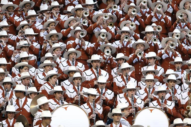 Keywords: band orchestra instrument music playing musician musical trumpet clarinet wind artist performance jazz enthusiasm american football game player pop uniforms play sound college band football fans crowd texas texan spectators