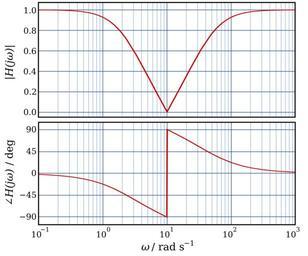 | Keywords: Band-Reject Filter Response.svg en The frequency reponse of a bend-stop filter with transfer function <math>H j\omega \frac 100-\omega 2 100-\omega 2+40j\omega </math> This is not a Bode plot as the magnitude axis is not logarithmic Own Inductiveload 2009-01-05 Band-reject filters |