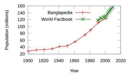 | Keywords: Bangladesh population 1900to2010.svg en Bangladesh's population 1900-2010 Based on Bangladesh's contemporary territory Early data is from Banglapedia Census which was derived from Indian and Bangladeshi census information A second series is from CIA World Factbook 1990-2010 own Dejo2 2010-02-13 gnuplot gnuplot source <source lang gnuplot >set terminal svg enhanced size 350 200 set samples 1001 high quality set border 31 linewidth 3 thin border set output bangladesh_population_1900to2010 svg set xlabel Year set ylabel Population millions set key left top plot Banglapedia dat using 1 2/1e6 with linespoints title 'Banglapedia' \ World_Factbook dat using 1 2/1e6 with linespoints title 'World Factbook' </source> Banglapedia dat <source lang gnuplot > 1901 28927786 1911 31555056 1921 33254096 1931 35604170 1941 41997297 1951 44165740 1961 55222663 1974 76398000 1981 89912000 1991 111455185 2001 123151246 </source> Wold_Factbook dat <source lang gnuplot > 1990 118433062 1992 119411711 1994 125149469 1996 123062800 1998 127567002 1999 127117967 2000 129194224 2001 131269860 2002 133376684 2003 138448210 2004 141340476 2005 144319628 2006 147365352 2007 150448339 2008 153546896 2010 156050883 </source> Temporal population graphs of Bangladesh |