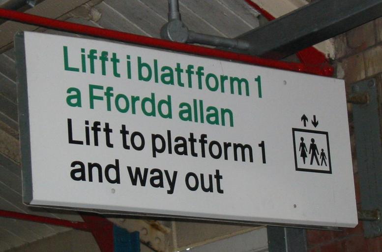 Keywords: Bangor bilingual station lift sign.jpg Welsh language Own 2007-12-01 Man vyi Own work all rights released Public domain Bilingual signs in Wales Bangor Gwynedd railway station Lifts