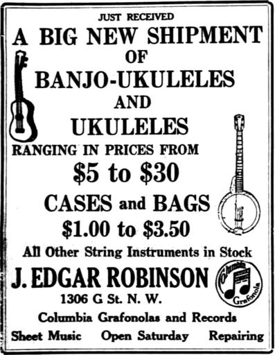 | Keywords: Banjo & Ukulele.jpg en George E K Awai and his Royal Hawaiian Quartet popularized the small guitar-like instrument when they performed at the Panama Pacific International Exposition at San Francisco in 1915 From then on to the early 1920s the ukulele became popular on the mainland United States Just received a big new shipment of banjo-ukuleles and ukuleles ranging in prices from 5 to 30 cases and bags 1 00 to 3 50 all other string instruments in stock J Edgar Robinson Banjo Ukulele Washington times July 17 1919 Image 11 http //chroniclingamerica loc gov/lccn/sn84026749/1919-07-17/ed-1/seq-11/ 1919-07-17 Chronicling America - http //chroniclingamerica loc gov/ Hawaii Digital Newspaper Project - https //hdnpblog wordpress com/ unknown other versions PD-old-70-1923 Newspaper advertising Banjos Ukulele Guitar family instruments Hawaiian music 1919 1910s Music stores String instruments |