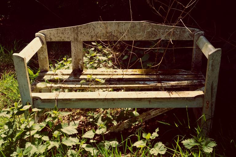 Keywords: bank bench wooden bench seat decay morsch lapsed forget stinging nettles
