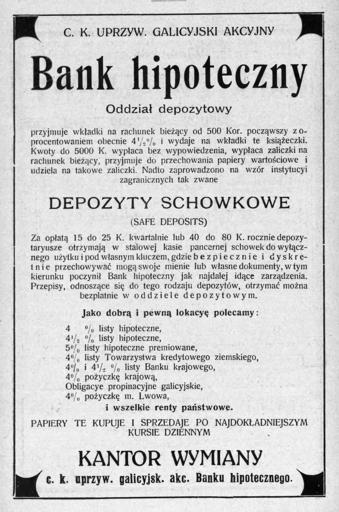 | Keywords: Bank hipoteczny - advertisement (01).jpg uk Реклама Іпотечного банку у львівському путівнику 1913 http //www sbc org pl/dlibra/docmetadata id 42 Księga adresowa Król Stoł Miasta Lwowa Rocznik 17 1913 dodatek s 62 author 1913 Advertisements in Lviv 1913 advertisements Banks in Lviv PD-old |