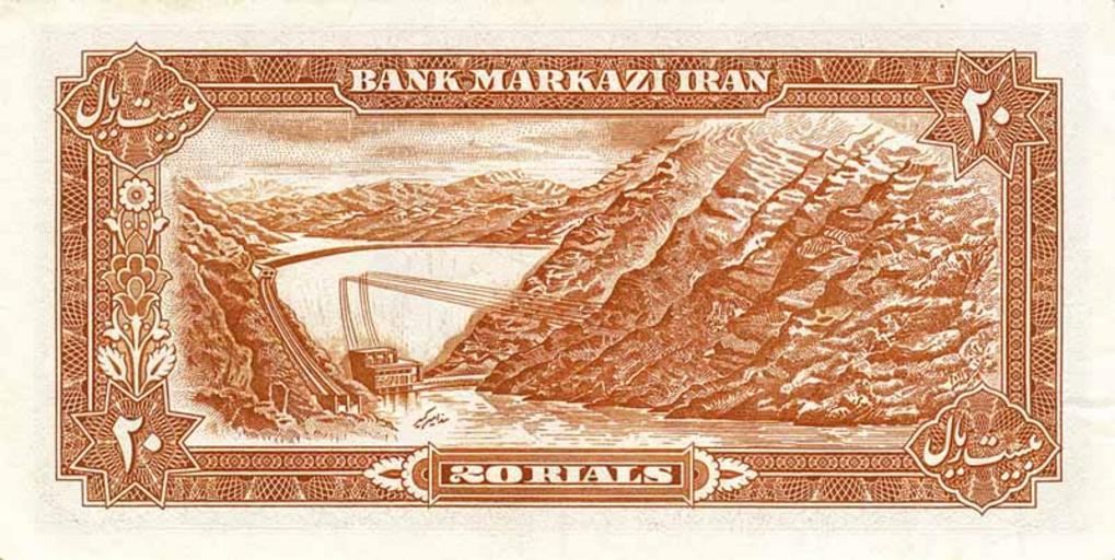 | Keywords: Banknote of shah - 20 rials (rear).jpg en Banknote of shah - 20 rials rear banknotes of central bank of Iran 2012-02-02 own Iran Persian Gulf Forever cc-zero Banknotes of Iran Mohammad Reza Pahlavi era 2 Toman 20 Rial banknotes Amir Kabir Dam |