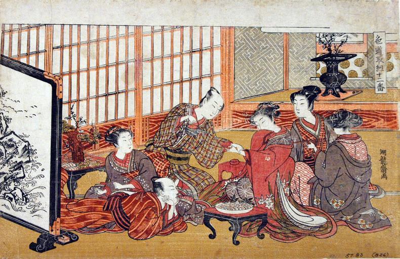 Keywords: Banquet in a wealthy household (5758877457).jpg en <b>Accession Number </b> 1957 83 <b>Display Artist </b> Isoda Koryusai <b>Display Title </b> Banquet in a wealthy household <b>Series Title </b> Shikido torikumi juniban Twelve Bouts in the Way of Love <b>Suite Name </b> Shikido torikumi juniban <b>Creation Date </b> 1770-1774 <b>Medium </b> Woodblock <b>Height </b> 9 7/8 in <b>Width </b> 15 1/4 in <b>Display Dimensions </b> 9 7/8 in x 15 1/4 in 25 08 cm x 38 74 cm <b>Credit Line </b> Bequest of Mrs Cora Timken Burnett <b>Label Copy </b> This early full-color print was the cover of an erotic album The kinds of flowers and food and drink indicate that the time of year is New Year The scene takes place in a brothel where two men are selecting the courtesans with whom they will celebrate the New Year <b>Label Copy Spanish </b> Este grabado a todo color fue la portada de un lbum ertico El tipo de flores comida y bebida indica que es poca de Ao Nuevo La escena se lleva a cabo en un burdel donde dos hombres seleccionan a las cortesanas con las cuales celebrarn el Ao Nuevo <b>Collection </b> <a href http //www sdmart org/art/our-collection/asian-art rel nofollow >The San Diego Museum of Art</a> 2007-05-09 14 54 53 https //www flickr com/photos/thesandiegomuseumofartcollection/5758877457/ Flickr en thesandiegomuseumofartcollection PD-old-100 Files from the San Diego Museum of Art to be checked |