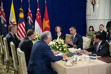 | Keywords: Barack Obama at ASEAN Summit 2012.jpg  Barack Obama attends the Trans-Pacific Partnership TPP meeting at the ASEAN Summit at Peace Palace in Phnom Penh on 20 November 2012 Taking part in the meeting clockwise from the President are the Sultan of Brunei Hassanal Bolkiah ; Prime Minister Najib Razak Mohammed Najib Abdul Razak of Malaysia; Prime Minister John Key of New Zealand; Prime Minister Lee Hsien Loong of Singapore; Prime Minister Nguyen Tan Dung of Vietnam; and Prime Minister Julia Gillard of Australia 2012-11-19 21 37 54 http //www flickr com/photos/whitehouse/8247637207 White House P112012PS-0130 Pete Souza DEFAULTSORT 20121119213754 PD-USGov Barack Obama in Cambodia 2012 Photographs by Pete Souza Taken with Canon EOS 5D Mark III Uploaded by O'Dea Uploaded with UploadWizard Hassanal Bolkiah Najib Tun Razak John Key Lee Hsien Loong with world leaders Nguyễn Tấn Dũng Julia Gillard |