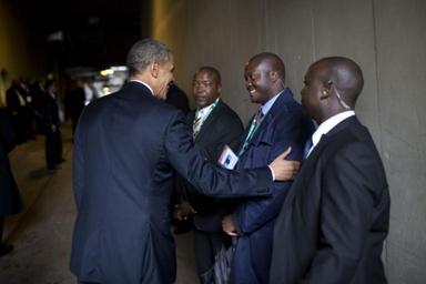 MAKE A MEME View Large Image Barack Obama greets South African security personnel.jpg en President of the United States Barack Obama greets security personnel from South Africa as he waits to take the stage at the memorial service for Nelson Mandela at Soccer City in ...