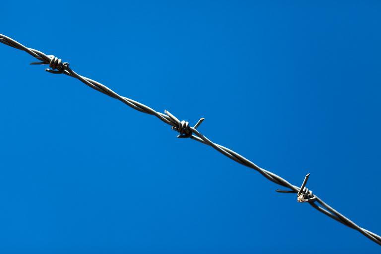 Keywords: barb barrier blue boundary danger fence iron metal protection secure security sharp sky steel barbed wire