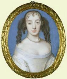 Keywords: people indoor picture frame Barbara Palmer, 1st Duchess of Cleveland (November 27 [O.S. November 17] 1640[1] – October 9, 1709) was an English courtesan and perhaps the most notorious of the many mistresses of Charles II of England. Born Barbara Villiers at the parish of St. Margaret's, Westminster, she was the only child of the 2nd Viscount Grandison, William Villiers (a half-nephew of the 1st Duke of Buckingham), and his wife, Mary Bayning, heiress of the 1st Viscount Bayning. On September 20, 1643, her father died in the English Civil War from a wound sustained at the Battle of Newbury while fighting for the Royalists. He had spent his considerable fortune on horses and ammunition for his Cavalier regiment; his widow and daughter were left in straitened circumstances. Shortly after Lord Grandison's death, Barbara's mother the Lady Mary remarried to Charles Villiers, Earl of Anglesea, a cousin of her late husband.[2] Upon the 1649 execution of King Charles I, the impoverished Villiers clan secretly transferred their loyalty to his son, Charles. Every year on May 29, the new King's birthday, young Barbara, along with her family, descended to the cellar of their home in total darkness and clandestinely drank to his health.[3] At that time, King Charles was wandering about the Continent, exiled and penniless. Tall, voluptuous, with masses of auburn hair, slanting, heavy-lidded blue-violet eyes, alabaster skin, and a sensuous, sulky mouth,[4] Barbara Villiers was considered to be one of the most beautiful Royalist women, but her lack of fortune left her with reduced marriage prospects. Her first serious romance was with Philip Stanhope, 2nd Earl of Chesterfield, but he was searching for a rich wife; he would wed Elizabeth Butler in 1660.[5] On 14 April 1659 she married Roger Palmer (later 1st Earl of Castlemaine) against his family's wishes; his father predicted that she would make him one of the most miserable men in the world. Palmer was a Roman Catholic. The two separated in 1662, following the birth of her first son. They remained married for his lifetime, but it is believed that Palmer did not father any of his wife's children. [1] She became King Charles's mistress in 1660, while still married to Palmer, and whilst Charles was still in exile at The Hague. The Palmers had joined the ambitious group of supplicants who sailed for Brussels at the end of 1659.[6] As a reward for her services, the King created her husband Baron Limerick and Earl of Castlemaine in 1661. Of her six children, five were acknowledged by Charles as his: 1. Lady Anne Palmer, later FitzRoy (1661-1722), probably daughter of Charles II, although some people believed she bore a resemblance to the Earl of Chesterfield. She later became the Countess of Sussex. 2. Charles Palmer, later FitzRoy (1662-1730), styled Lord Limerick and later Earl of Southampton, created Duke of Southampton (1675), later 2nd Duke of Cleveland (1709) 3. Henry FitzRoy (1663-1690), created Earl of Euston (1672) and Duke of Grafton (1675) 4. Charlotte FitzRoy (1664-1718), later Countess of Lichfield. She gave birth to twenty children. 5. George FitzRoy (1665-1716), created Earl of Northumberland (1674) and Duke of Northumberland (1683) 6. Barbara (Benedicta) FitzRoy (1672-1737) - Cleveland claimed that she was Charles' daughter, but she was probably the child of her mother's second cousin and lover, John Churchill, later Duke of Marlborough By 1662, Barbara, the King's mistress, had more influence at the court than his Queen, Catherine of Braganza. In point of fact, Barbara chose to give birth to their second child at Hampton Court Palace while he and the Queen were honeymooning.[7] In the summer of 1662 she was appointed Lady of the Bedchamber despite opposition from Queen Catherine and Edward Hyde, 1st Earl of Clarendon, one advisor to the King and a bitter enemy of Barbara's. Behind closed doors, Barbara and the Queen feuded constantly. Barbara's influence over the King waxed and waned. Her victory, of her appointment as Lady of the Bedchamber, was followed by rumours of an estrangement between her and the King, being the result of his infatuation with Frances Stuart. In December 1663, Barbara announced her conversion to Catholicism; historians disagree as to why she did so. Some believe it was an attempt to consolidate her position with the King, and some believe it was a way of strengthening her ties with her Catholic husband. In June 1670 Charles created her Baroness Nonsuch (being the owner of Nonsuch Palace). She was also, briefly, granted the ownership of Phoenix Park in Dublin as a present from the King. She was made Countess of Southampton and Duchess of Cleveland in her own right; however, no one at court was sure if this was an indication that she was being jettisoned by Charles, or whether this was a sign that she was even higher in his favours. The Dukedom was made with a special remainder which allowed it to be passed to her eldest son, Charles FitzRoy, despite him being illegitimate. Barbara was known for her dual nature. Diarist John Evelyn called her "the curse of the nation";[8] yet, others described her as great fun, keeping a good table and with a heart to match her famous temper. Lady Barbara took advantage of her influence over the King, using it to her own benefit. She would help herself to money from the Privy Purse and take bribes from the Spanish and the French. She was famously extravagant and promiscuous. She also meddled in politics, supporting the Second Dutch War (declared in February 1665), along with most of the court and Parliament.[9] But there are accounts of exceptional kindness from Barbara; once, after a scaffold had fallen onto a crowd of people at the theatre, she rushed to assist an injured child, and was the only court lady to have done so. While the King had taken other mistresses, the most notable being the actress Nell Gwynne, Barbara took other lovers too, including the acrobat Jacob Ha
