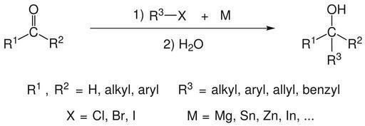 Keywords: Barbier coupling overview v1.svg en Reaction overview of the Barbier coupling de à bersicht über die Barbier-Kupplung selbst erstellt mit ChemBioDraw 11 LinuxCLP 11-08-13 Cc-zero Barbier reaction