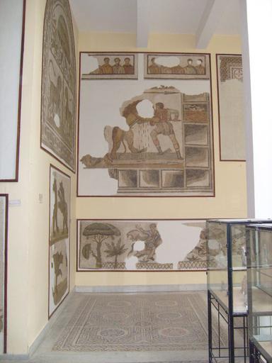Keywords: Bardo mosaics room-6.JPG Salle du département de mosaïques romaines du Musée national du Bardo Tunisie Scena di venatio con un gladiatore bestiarius che combatte contro un leone mentre il pubblico assiste Mosaico pavimentale romano da Thelephte ora al Museo del Bardo a Tunisi II secolo d C own 2008-09-27 Moumou82 Own work all rights released Public domain Bestiarius mosaic from Thelepte in the Bardo National Museum Tunis |