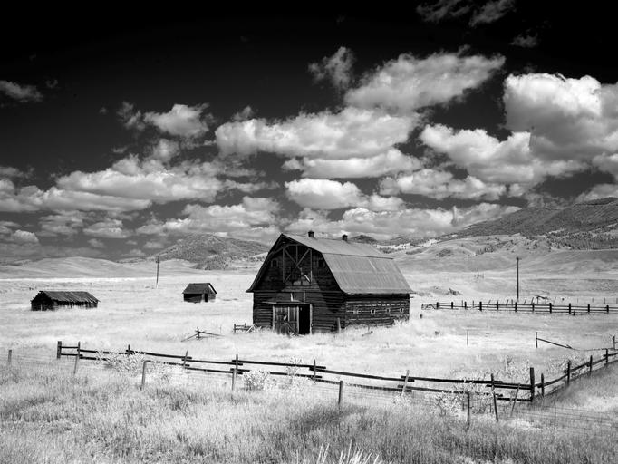 Keywords: barn stadl montana agriculture rural nature grass meadow landscape usa united states america infra red united states of america clouds sky north america summer sw black and white black white