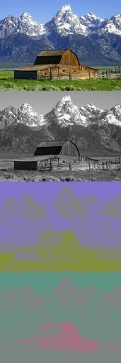 Keywords: Barns grand tetons YCbCr separation.jpg This takes an image Image Barns grand tetons jpg and displays the Y Cb and Cr elements of it Note that the Y image is essentailly a greyscale copy of the main image; that the white snow is represented as a middle value in both Cb and Cr; that the brown barn is represented by strong Cb and strong Cr; that the green grass is represented by strong Cb and weak Cr; and that the blue sky is represented by weak Cb and weak Cr The murkiness of the Cb and Cr elements to the human eye demonstrate why many image compression codecs downsample colour; details in Y are much more visible than in Cb or Cr Based on the public domain photo Image Barns grand tetons jpg Code above and resulting output by Mike1024 Uploaded 2006-12-26 Mike1024 Generator code In MATLAB <pre>RGBimage imread 'barns_grand_tetons jpg' ; height width depth size RGBimage ; YCbCrimage RGB2YCbCr RGBimage ; If you don't have the right version/toolkit this function might not be availiable Luckily it's easy to implement ourselves Drop me Mike1024 a message and I'll send you my code to do it Newer versions of matlab need outputimage zeros height 4 width depth 'uint8' ; outputimage uint8 zeros height 4 width depth ; for w 1 width for h 1 height outputimage h w 1 YCbCrimage h w 1 ; Copy Y Cb and Cr for normal image outputimage h w 2 YCbCrimage h w 2 ; outputimage h w 3 YCbCrimage h w 3 ; outputimage h+height w 1 YCbCrimage h w 1 ; Copy Y only for first component outputimage h+height w 2 128; outputimage h+height w 3 128; outputimage h+ 2 height w 2 YCbCrimage h w 2 ; Cb only for second component outputimage h+ 2 height w 1 128; outputimage h+ 2 height w 3 128; outputimage h+ 3 height w 3 YCbCrimage h w 3 ; Cr only for third component outputimage h+ 3 height w 1 128; outputimage h+ 3 height w 2 128; end end image YCbCr2RGB outputimage ; imwrite YCbCr2RGB outputimage 'YCbCr_separation jpg' 'jpeg' ;</pre> YCbCr |
