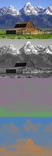 Keywords: Barns grand tetons YCgCo separation.jpg en Shows the separation of the image into Y Cg and Co color components Based on the public domain photo Image Barns grand tetons jpg Devcore Color spaces John Moulton barn