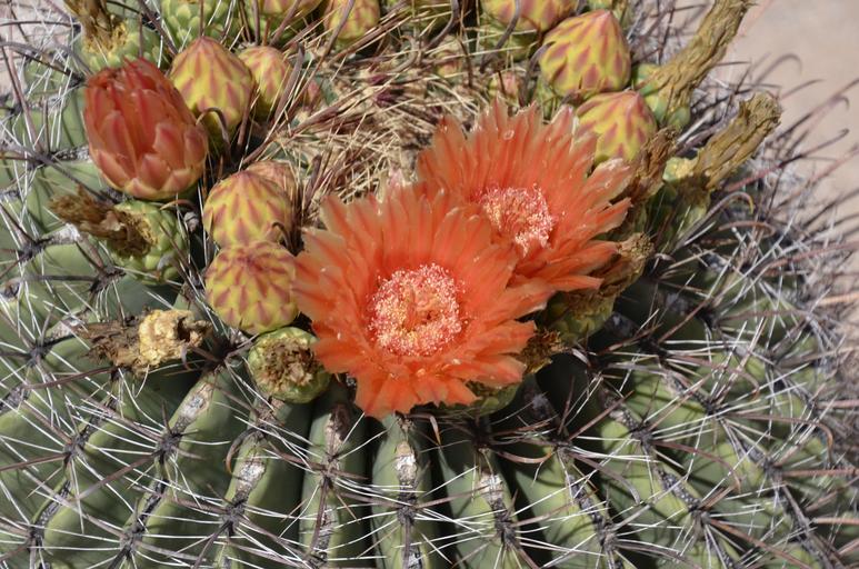Keywords: barrel cactus orange flower bloom desert garden nature plant green spike cacti