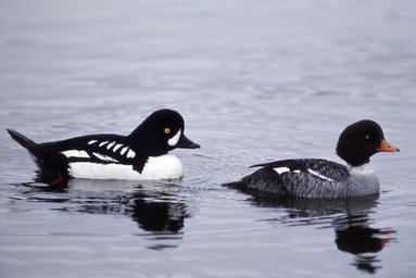 Keywords: barrow's goldeneye ducks drake hen swimming water portraits wildlife nature male female wild waterfowl