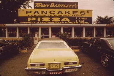 | Keywords: BartlettsPancakesWisconsin.jpg  Tommy Bartlett's pancake and pizza restaurant Wisconsin 1973 Exterior view with signage promoting Pancakes Pizza Spaghetti Sandwiches Dinner Menu In front of the door a yellow w Oldsmobile with 1972 Iowa license plate 31 41377 is parked in the foreground This apparently was in Lake Dalton Wisconsin and later torn down and the site used for Tommy Bartlett's House of Tomorrow NEAR THE TOWN OF WISCONSIN DELLS THE WISCONSIN RIVER CHANNELS THROUGH DEEP SOFT SANDSTONE CLIFFS CUTTING THE ROCK INTO FANTASTIC SHAPES THESE NATURAL SPLENDORS HAVE GIVEN RISE TO A BOOMING TOURIST INDUSTRY PEOPLE COME IN DROVES OFTEN IN CAMPERS AND TRAILERS BOAT TRIPS SHOPS BARS AND DIVERSIONS OF EVERY KIND VIE FOR PATRONAGE IN AN AMUSEMENT COMPLEX EXTENDING 2 OR 3 MILES BEYOND THE TOWN 09/1973 Photograph by Jonas Dovydenas for Series DOCUMERICA The Environmental Protection Agency's Program to Photographically Document Subjects of Environmental Concern compiled 1972 - 1977 NARA-image 554188 Old version converted from gif to jpg and border cropped before upload New version lossless crop from File NEAR THE TOWN OF WISCONSIN DELLS THE WISCONSIN RIVER CHANNELS THROUGH DEEP SOFT SANDSTONE CLIFFS CUTTING THE ROCK - NARA - 554188 jpg 1973-09 Jonas Dovydenas No restrictions PD-USGov <gallery> File NEAR THE TOWN OF WISCONSIN DELLS THE WISCONSIN RIVER CHANNELS THROUGH DEEP SOFT SANDSTONE CLIFFS CUTTING THE ROCK - NARA - 554188 jpg uncropped JPEG from NARA File NEAR THE TOWN OF WISCONSIN DELLS THE WISCONSIN RIVER CHANNELS THROUGH DEEP SOFT SANDSTONE CLIFFS CUTTING THE ROCK - NARA - 554188 tif uncropped TIFF from NARA </gallery> location possible 1972 license plates September 1973 in the United States 1973 in Wisconsin Automobiles in Wisconsin Black on yellow license plates Color reversal Jonas Dovydenas Lake Delton Wisconsin License plates of Iowa Oldsmobile Omega X-body RWD Restaurant signs in the United States Pancakes of the United States Pizzerias in Wisconsin Tommy Bartlett Signs in Wisconsin U S Route 12 in Wisconsin Wisconsin Highway 23 Yellow automobiles |