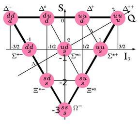 Keywords: Baryon-decuplet.svg Premier décuplet de baryons Own 2007-12-20 Trassiorf Trassiorf Baryon-decuplet-small svg Image Baryon decuplet png Image Baryondekuplett svg Image Decupleto bariônico png The image Baryon-decuplet-small svg is 20 smaller in dimensions fr Ceci représente le premier décuplet de baryons regroupés selon le schéma SU 3 « La voie octuple » Sur cette figure reprenant la disposition conventionnelle I<sub>3</sub> est l'axe de la composante d'isospin Q est l'axe de la charge électrique S est l'axe de l'étrangeté « strangeness » Le contenu principal des particules en quarks est noté dans les cercles roses en This shows the first baryon decuplet grouped according to the SU 3 scheme « Eightfold way » On this figure in the standard layout I<sub>3</sub> is the isospin component axis Q is the electric charge axis S is the strangeness axis The main quark content is indicated within the pink circles de Das Baryonen-Dekuplett gemäß dem SU 3 -Schema dem «Achtfachen Weg» I<sub>3</sub> ist die Isospin-Achse Q ist die Ladungsachse S ist die Strangeness-Achse Die enthaltenen Quarks werden in den rosa Kreisen gezeigt Baryon multiplets |