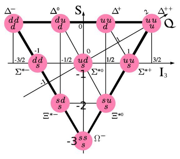 | Keywords: Baryon-decuplet.svg Premier décuplet de baryons Own 2007-12-20 Trassiorf Trassiorf Baryon-decuplet-small svg Image Baryon decuplet png Image Baryondekuplett svg Image Decupleto bariônico png The image Baryon-decuplet-small svg is 20 smaller in dimensions fr Ceci représente le premier décuplet de baryons regroupés selon le schéma SU 3 « La voie octuple » Sur cette figure reprenant la disposition conventionnelle I<sub>3</sub> est l'axe de la composante d'isospin Q est l'axe de la charge électrique S est l'axe de l'étrangeté « strangeness » Le contenu principal des particules en quarks est noté dans les cercles roses en This shows the first baryon decuplet grouped according to the SU 3 scheme « Eightfold way » On this figure in the standard layout I<sub>3</sub> is the isospin component axis Q is the electric charge axis S is the strangeness axis The main quark content is indicated within the pink circles de Das Baryonen-Dekuplett gemäß dem SU 3 -Schema dem «Achtfachen Weg» I<sub>3</sub> ist die Isospin-Achse Q ist die Ladungsachse S ist die Strangeness-Achse Die enthaltenen Quarks werden in den rosa Kreisen gezeigt Baryon multiplets |