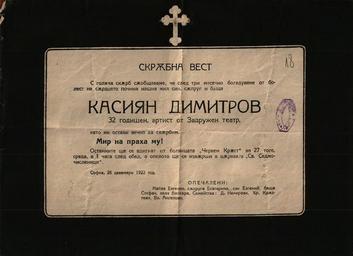| Keywords: BASA-1154K-1-252-18-Kasiyan Dimitrov Obuituary.JPG ек олог на Касиян Димит ов Kasiyan Dimitrov Obuituary Կասիյան Դիմիտ ովի մահախոսականը 1922-12-26 author ЦДА 1154K Иван Попов 1 252 18 credit line exhibition history BASA Спасими <span class signature-talk >talk</span> 2015-04-17 other versions Anonymous-EU Obituaries of Bulgaria Kasiyan Dimitrov 1922 obituaries | ||||