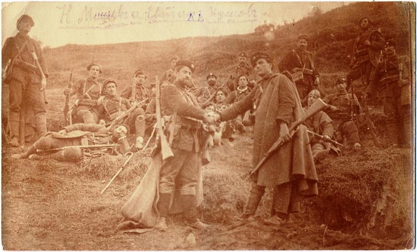 Keywords: BASA 1942K-1-62-5 Kostadin Mishev, Evtim Kushev, 1923.jpg Бълга ският еволюционе войвода на Вът ешната македоно-од инска еволюционна о ганизация Костадин ишев с четата си на п еден план вляво и Евтим Кушев вдясно Снимката се нами а в а хива на икола алешевски с посвещение на гъ ба Д аги Дядо Коле Исп ащам Ви настоящата ка тичка за споменъ Снимката е нап авена п езъ 1923 г 12 XII до г аницата Доб и лаки Това беше като се завъ нахте отъ алешевско и Радовишко след като нап авихте окол <конт и > Това сме К ишевъ и Евтимъ Кушевъ вашия С позд авъ подпис За Дядо Коле алешевски въ г Дупница 15 ма т 1925 г Bulgarian revolutionaire member of the Internal Macedonian-Adrianopolitan Revolutionary Organization Kostadin Mishev front left with his band and Evtim Kushev front right ბულგარელი რევ ლუცი ერი შიდა მაკედ ურ-ადრია პ ლიტა ური რევ ლუციური რგა იზაციის წევრი კ სტადი მიშევი წი მარცხ ივ თავის ჯგუფთა და ევტიმ კუშევთა წი მარჯვ ივ ერთად Буга ски еволуциона члан Унут ашње македонско-јад анске еволуциона не о ганизације Костадин ишев нап ед лево са својом четом и Евтимом Кушевим нап ед десно 1923-12-12 author ЦДА 1942К икола алешевски 1 62 5 credit line exhibition history BASA Spiritia <span class signature-talk >talk</span> 2012-04-25 other versions Anonymous-EU Kostadin Mishev |