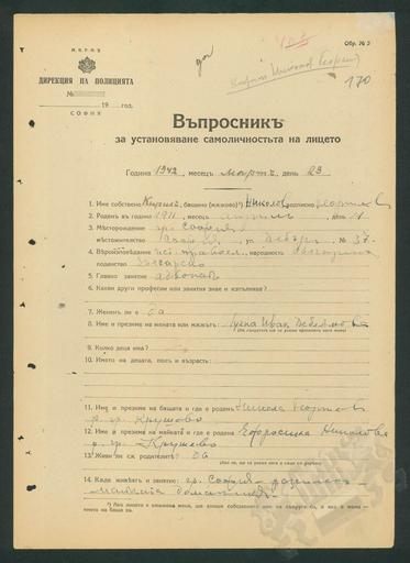 | Keywords: BASA-F. 2123-1-OB105611D-170l.jpg Въп осник за установяване на самоличност на Ки ил иколов Гео гиев задъ жан в Ди екция на полицията в София на 22 ма т 1942 г азпитан на 23 ма т 1942 г пъ ва част Questionnaire for identification of Kiril Nikolov Georgiev detained in Police Directorate in Sofia - March 23 1942 part I 1942-03-23 author ЦДА 2123К 1 ОБ 105611 Д 170 лице credit line exhibition history Bulgarian Archives State Agency unknown other versions en Questionnaire for identification of Kiril Nikolov Georgiev detained in Police Directorate in Sofia - March 23 1942 part I bg Въп осник за установяване на самоличност на Ки ил иколов Гео гиев задъ жан в Ди екция на полицията в София на 22 ма т 1942 г азпитан на 23 ма т 1942 г пъ ва част Central State Archive Sofia author 1942-03-23 Anonymous-EU Documents in the Bulgarian Archives |
