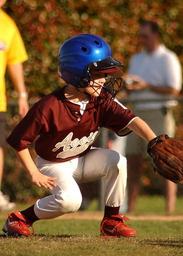 Keywords: baseball little league player sport game field youth uniform athlete competition young grass helmet athletic male action glove