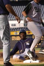 Keywords: baseball runner third base slide coach third baseman college men male running safe glove athletes sports action