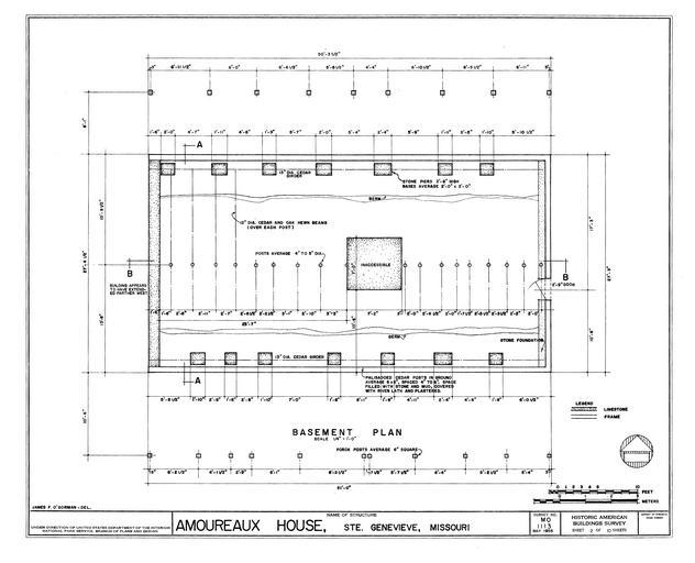 | Keywords: Basement Floor and Structural Plan-- Amoureaux House in Ste Genevieve MO.png This is a measured drawing showing basement plan and structural foundations of the Amoureaux House in Ste Geneviève Missouri The Amoureaux House sometimes called the Bauvais-Amoureux House was built in in 1793 in Ste Geneviève Missouri It was built by Benjamin Amoureaux who came from France It is currently operated as a museum by the Missouri Department of Natural Resources It is one of three <i>poteaux-en-terre</i> buildings that survive The others are the Bequet-Ribault House and the Vital St Gemme Beauvais House I 20 S Main Street Historic American Engineering Record National Park Service; Record MO-1113 1956-05 Drawn by James F O ™Gorman MO-1113 Amoureaux house drawings Cellars Floor plans of houses |