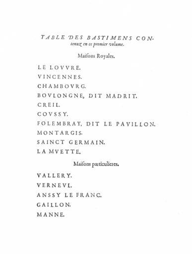 | Keywords: Bastiments v1 (Gregg 1972 p03) - TOC.jpg Page of text with the table of contents from Le premier volume des plus excellents Bastiments de France by Jacques I Androuet du Cerceau <br /><--previous page Space 10 next page--> Scan Androuet Jacques 1576 Le premier volume des plus excellents Bastiments de France Paris Reduced size reprint Gregg International 1972 ISBN 9780576154086 1576 Creator Jacques I Androuet du Cerceau PD-old-100 Le premier volume des plus excellents Bastiments de France Gregg 1972 reprint |