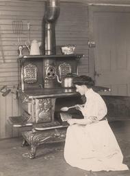 Keywords: food preparation foodpreparation women monochrome Photographer: Reuben R. Sallows (1855 - 1937) Description: Woman kneels in front of cast iron cook stove basting a roast; wears white skirt, striped blouse with rolled up sleeves, white collar upturned, dark bow tie; hair upswept; coffee pot on upper left shelf of stove; closed door in background on right; date (1910/44) in pencil and Sallows stamp in blue ink on back; writing in ink on back identifies subject as Florence Sallows Saunders Object ID : 0410-rrs-ogohc-ph View additional photographs by Sallows that are held in other collections at the Reuben R. Sallows Digital Library. Order a higher-quality version of this item by contacting the Huron County Museum (fee applies). Photographer: Reuben R. Sallows (1855 - 1937) Description: Woman kneels in front of cast iron cook stove basting a roast; wears white skirt, striped blouse with rolled up sleeves, white collar upturned, dark bow tie; hair upswept; coffee pot on upper left shelf of stove; closed door in background on right; date (1910/44) in pencil and Sallows stamp in blue ink on back; writing in ink on back identifies subject as Florence Sallows Saunders Object ID : 0410-rrs-ogohc-ph View additional photographs by Sallows that are held in other collections at the Reuben R. Sallows Digital Library. Order a higher-quality version of this item by contacting the Huron County Museum (fee applies). |