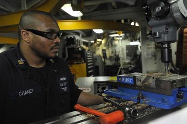 Keywords: Bataan Amphibious Ready Group, 2014 Deployment 140425-N-AO823-019.jpg en Machinery Repairman 1st Class Thomas Chaney from Detroit drills a vane for a waste water pump in the machine room aboard the multipurpose amphibious assault ship USS Bataan LHD 5 Bataan is the flagship for the Bataan Amphibious Ready Group and with the embarked 22nd Marine Expeditionary Unit is deployed in support of maritime security operations and theater security cooperation efforts in the U S 5th Fleet area of responsibility U S Navy photo by Mass Communication Specialist Seaman Apprentice Michael J Lieberknecht/ Released 2014-04-25 Michael Lieberknecht https //www dvidshub net/image/1274104 140425-N-AO823-019 2014-04-25 15 42 USS BATAAN AT SEA PD-USGov-Military-Navy USS Bataan LHD-5 22nd Marine Expeditionary Unit Images from DoD uploaded by Fæ |