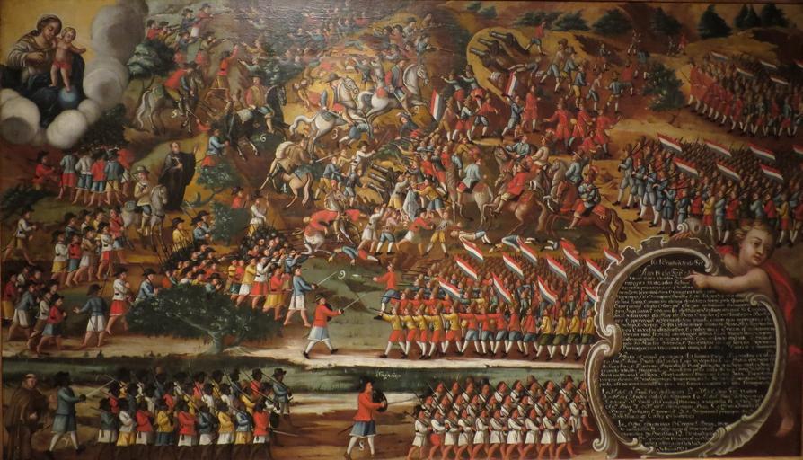 | Keywords: Batalha dos Guararapes.jpg  author Ex-voto Batalha dos Guararapes Ex-voto Battle of Guararapes 1758 Oil on canvas cm 122 217 Museu Histórico Nacional Rio de Janeiro Peça votiva conhecida como Batalha dos Guararapes que registra um pedido relacionado à origem da Igreja de Nossa Senhora dos Prazeres do Monte de Guararapes no Recife formulado durante uma das maiores batalhas ocorridas na época colonial e que significou a perda pelos holandeses do controle do território pernambucano fora do Recife A prática do ex-voto introduzida no Brasil durante o período colonial e logo incorporada à nossa cultura foi bastante difundida entre nós tendo perdurado em menor escala até os nossos dias O ex-voto é a representação iconográfica de determinada graça obtida e o testemunho público da força do agraciador São esculturas em madeira e mais recentemente em cera reproduzindo a parte do corpo curada ou ainda pinturas descrevendo o milagre da cura Além do seu valor artístico algumas dessas pinturas pela riqueza da narrativa cênica servem de importante fonte de informação para o estudo de determinada época own PD-old-100 Other versions Dutch Brazil Paintings in the Museu Histórico Nacional Battle of Guararapes Baroque paintings from Brazil 18th-century paintings from Brazil 1758 1758 paintings Ex voto in Brazil |