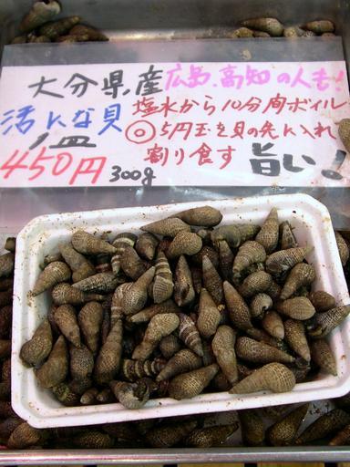 Keywords: Batillaria multiformis 01 for sale.JPG --おやつ <span class signature-talk >talk</span> 12 46 31 August 2011 UTC Summary Living horn snails Batillaria multiformis from Ōita Prefecture for sale at a fish market in Tokyo Japan 大分 産活にな 1皿(300g)450円 塩水から10分間 イルして五円玉で の先を折って肉を割り出す 旨い Own 2006-06-10 jibun Batillaria multiformis Cuisine of Oita prefecture Pricing in Japanese
