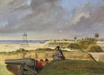Keywords: outdoor "This battery was on Sullivan's Island, near Fort Moultrie which can be seen in the distance. The gun shown, was considered to be a very good one. The day was cloudy when the scene was sketched." Conrad Wise Chapman, 1898 The American Civil War Museum, Richmond, Va "This battery was on Sullivan's Island, near Fort Moultrie which can be seen in the distance. The gun shown, was considered to be a very good one. The day was cloudy when the scene was sketched." Conrad Wise Chapman, 1898 The American Civil War Museum, Richmond, Va |