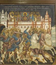 Keywords: Battle between Novgorod and Suzdal (fresco) 04.jpg Ф еска Битва новго одцев с суздальцами 1742 1743 Я ославль Известковый г унт темпе а Из соб ания Госуда ственной Т етьяковской гале еи 1742 1743 Creator Unknown PD-Art Battle between Novgorod and Suzdal fresco GTG Exhibition Sainte Russie Moscow 2011 |