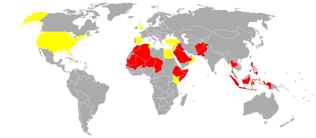 Keywords: Battlefields in The Global War on Terror - edit02.png Further Revised Map Red indicates nations in which military efforts are being made to fight terrorism under the War on Terror campaign Yellow indicates nations involved in the War on Terror campaign where terrorist attacks have occurred This excludes countries like Russia and India which have been subject to terrorist attacks and have independent ongoing anti-terror operations Transferred from http //en wikipedia org en wikipedia; transferred to Commons by User Unionhawk using http //tools wikimedia de/~magnus/commonshelper php CommonsHelper <br/> Original text I Chocolate Horlicks talk created this work entirely by myself 08 01 21 November 2010 UTC <br/> 2010 11 21 first version ; 2011 01 01 last version Chocolate Horlicks talk Original uploader was Chocolate Horlicks at http //en wikipedia org en wikipedia Later version s were uploaded by Atrix20 at http //en wikipedia org en wikipedia Released into the public domain by the author http //en wikipedia org/wiki/File Battlefields_in_The_Global_War_on_Terror_-_edit01 PNG en wikipedia Chocolate Horlicks Original upload log page en wikipedia Battlefields_in_The_Global_War_on_Terror_-_edit02 png 2011-01-01 23 09 Atrix20 1425×625× 49383 bytes <nowiki></nowiki> 2010-11-21 08 01 Chocolate Horlicks 1425×625× 54999 bytes <nowiki> Further Revised Map Red indicates nations in which military efforts are being made to fight terrorism under the War on Terror campaign Yellow indicates nations involved in the War on Terror campaign where Islamic terror</nowiki> Uncategorized 2014 May 16 |