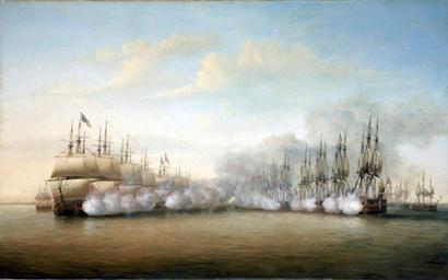 Keywords: Battlescene1.jpg en The Battle of Negapatam 1782 between the French and the English Source http //www nmm ac uk/searchbin/searchs pl exhibit it0516i axis 1101400722 flash true dev downloaded Dec 2004 Battle of Negapatam 6 July 1782 Artist Dominic Serres the Elder Date 1786 Oil on canvas 1117 6 x 1828 8 mm National Maritime Museum London Greenwich Hospital Collection The French were seeking to take control of the British-held port of Negapatam on the eastern coast of India There was no clear result but the British managed to force a French retreat The action was fought with the two opposing fleets lined up in their squadrons firing at each other This line formation dominated sea warfare in the 18th century 1782 http //www columbia edu/itc/mealac/pritchett/00routesdata/1700_1799/coromandel/negapatam/negapatam html Dominic Serres the Elder PD-old-100 Uploaded with UploadWizard Wars of France Wars of the United Kingdom |