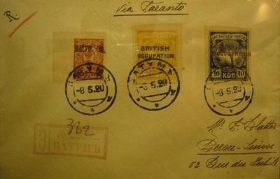 Keywords: Batum letter 8May1920.JPG en A cover with British Batumi occupation overprint stamps cancelled 8 May 1920 ru Конве т с гашением 8 5 1920 года ма ок с надпечаткой б итанской оккупации г Батуми Own 1920 Scaned 2008 01 27 Leonid Dzhepko <gallery> File Batum letter 8May1920 40 k jpg File Batum letter 8May1920 5 k jpg File Batum letter 8May1920 4 kon jpg File Batum letter 8May1920 A jpg </gallery> product of a long-defunct government PD-old Stamps of Batumi 1920 stamps Overprints Stamps on covers and postcards |
