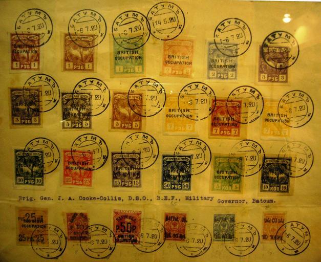 Keywords: Batum stamps cancellation.JPG 1920 cancellation of British Batumi occupation overprint stamps Гашение 1920 года ма ок с надпечаткой б итанской оккупации г Батуми Own 2008-01-27 Leonid Dzhepko product of a long-defunct government PD-old Stamps of Batumi 1920 stamps Overprints Various stamps in one image |